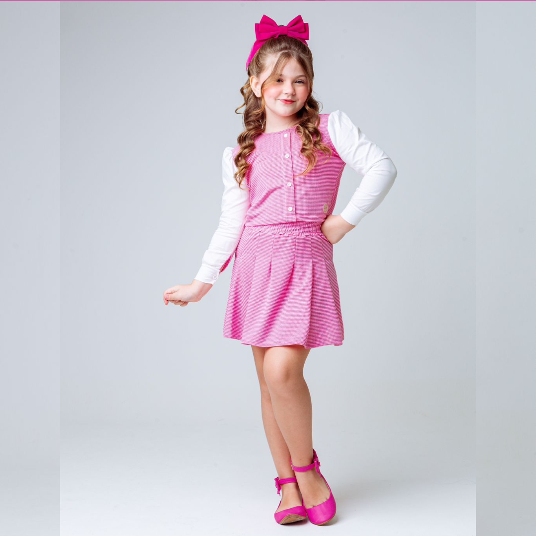 Um tecido elegante e com um toque macio perfeito de malha encorpada, a composição é 49% viscose, 47% poliéster e 4% elastano, a estampa Pétit Square (quadrado pequeno) na cor rosa está super em alta e a padronagem dessa saia plinssada + camisa com manga em tricoline é a cereja do bolo!